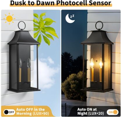 Upgrade your home’s exterior with this 21″ modern black outdoor wall lantern, designed with both elegance and practicality in mind. Featuring an advanced dusk to dawn sensor, this 2-light wall sconce automatically turns on at night and off at dawn, offering hands-free convenience, enhanced security, and energy savings.