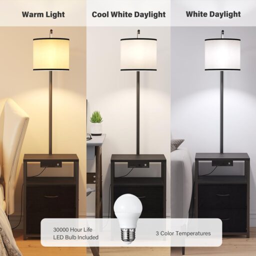Designed with convenience in mind, the lamp includes 2 USB ports and 1 AC charging socket, allowing you to easily charge your devices like smartphones, tablets, and more while enjoying the warm ambiance of the lamp. The included 3-color temperature E26 LED bulb provides soft, energy-efficient lighting, with options for warm, yellow, or white daylight, perfect for any mood or setting.