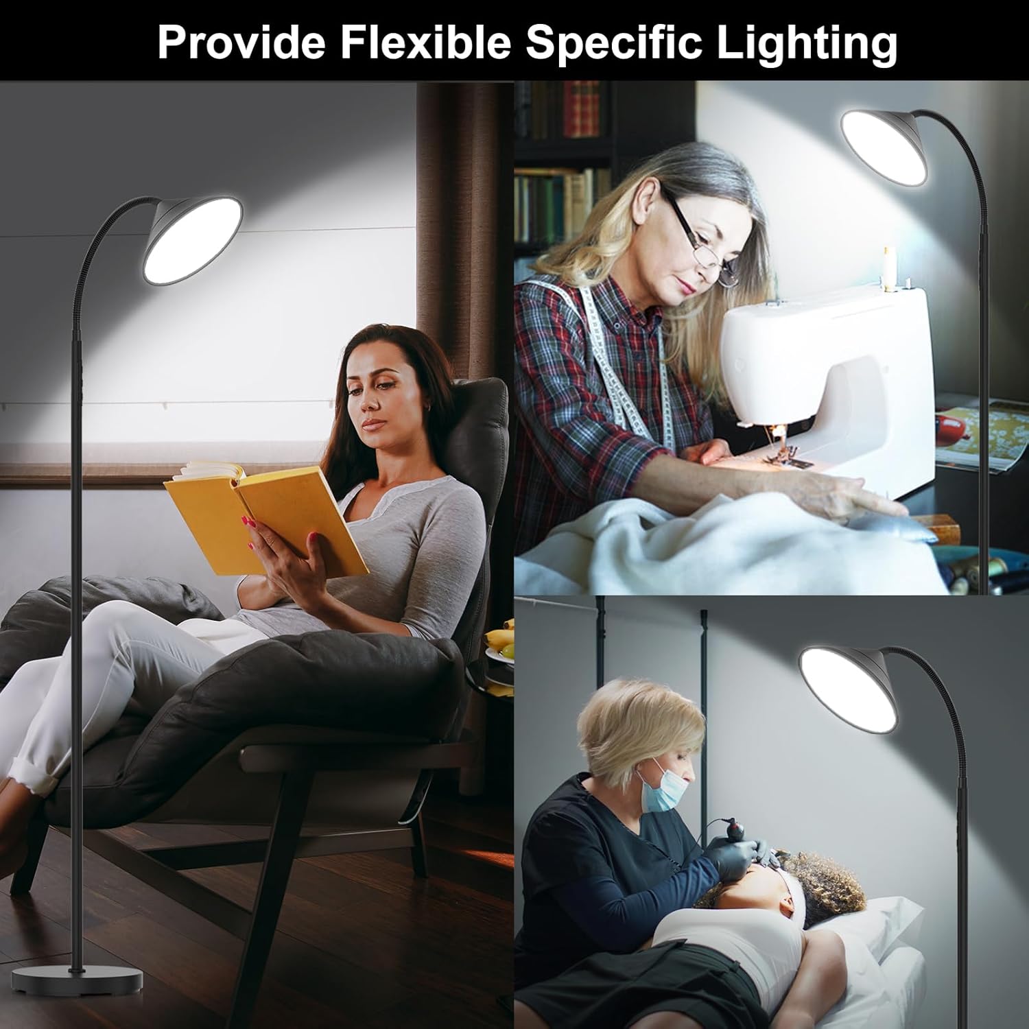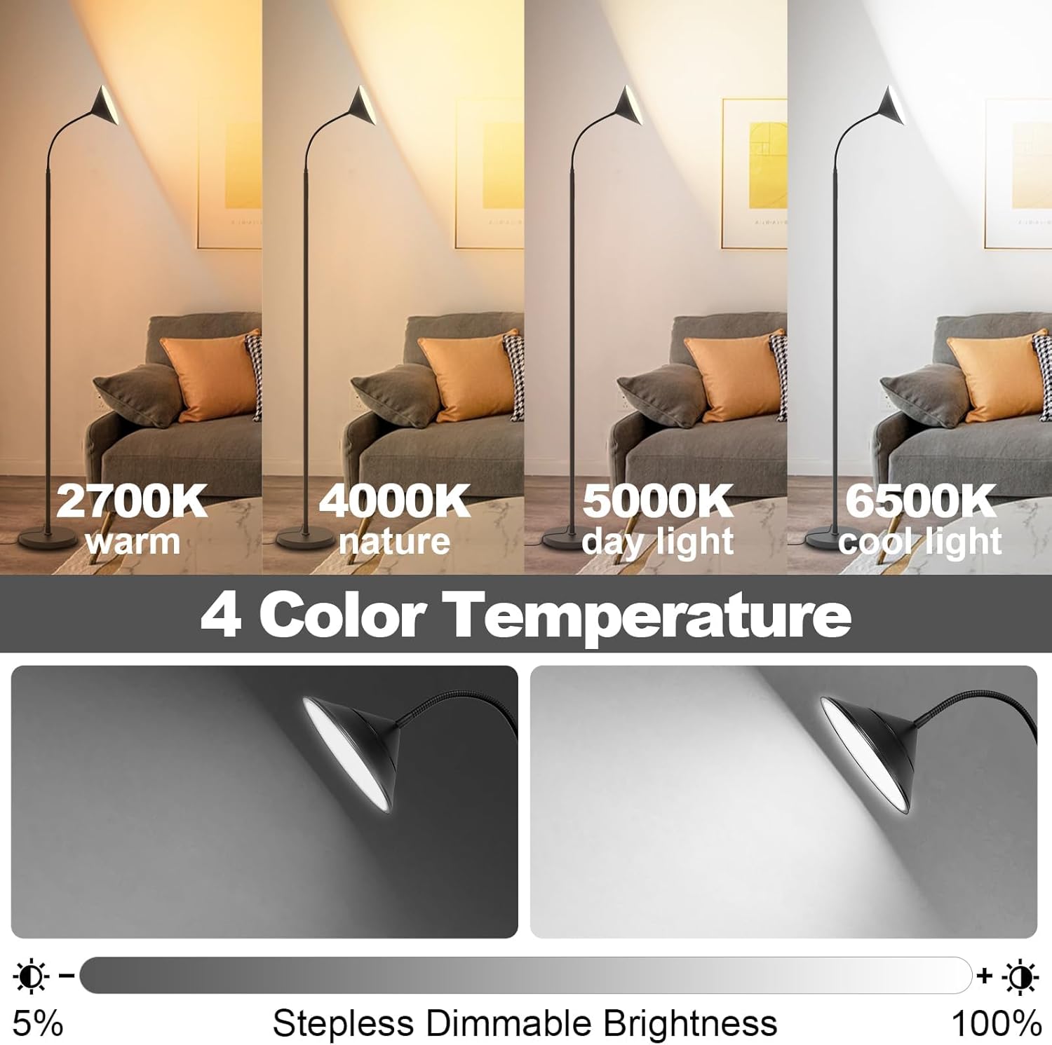 Stepless Dimming & Adjustable Color Temperature: Customize your lighting with 4 adjustable color temperatures (2700K-6500K) and 10%-100% brightness control. Perfect for reading or relaxation, the smart memory function remembers your last setting when you turn the lamp on again.