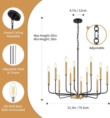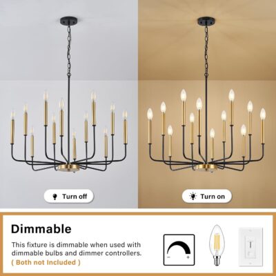 Designed for versatility, this chandelier is dimmable when paired with dimmable bulbs and a compatible dimmer switch (both sold separately). It requires twelve E12 base bulbs (up to 40W each) and is compatible with incandescent, LED, CFL, and halogen bulbs (bulbs not included). Create the perfect ambiance by adjusting the brightness to suit your needs.