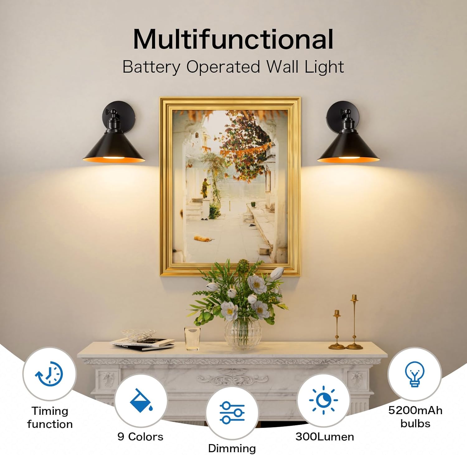 This battery-operated wall sconce set of two includes two E26 base rechargeable 300-lumen bulbs. Each bulb features a powerful 5200mAh battery, providing up to 25 hours of maximum brightness or 72 hours at minimum brightness. These vintage-style wall sconces offer versatile, long-lasting illumination for any space.