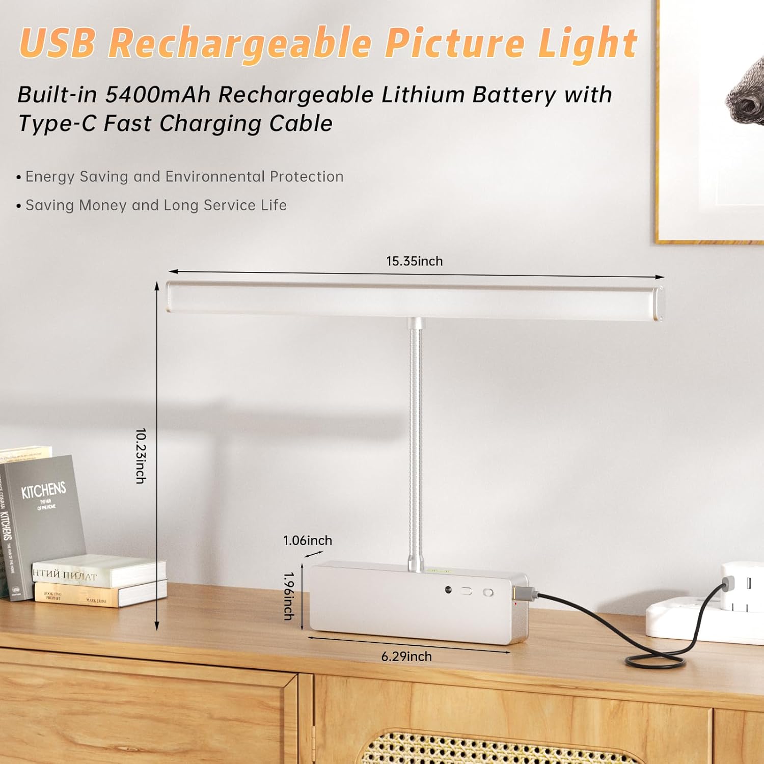 Showcase your favorite paintings, photos, and artwork beautifully without the hassle of tangled cords. Our Wireless Rechargeable Picture Light ensures a clean, elegant look while providing adjustable lighting to highlight your treasured pieces. Featuring a 360° rotatable light head, you can direct the illumination exactly where it’s needed. This enhances the aesthetics of any space. Additionally, the built-in 5400mAh rechargeable battery guarantees long-lasting performance without frequent recharging.