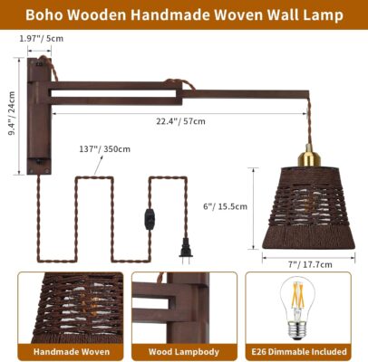 Elevate your interior with this beautifully designed Wood Plug-In Wall Light, featuring a rustic swing arm and a hand-woven boho lampshade that blends farmhouse character with minimalist elegance. Its natural wood finish and vintage aesthetic bring a cozy, timeless charm to any space.